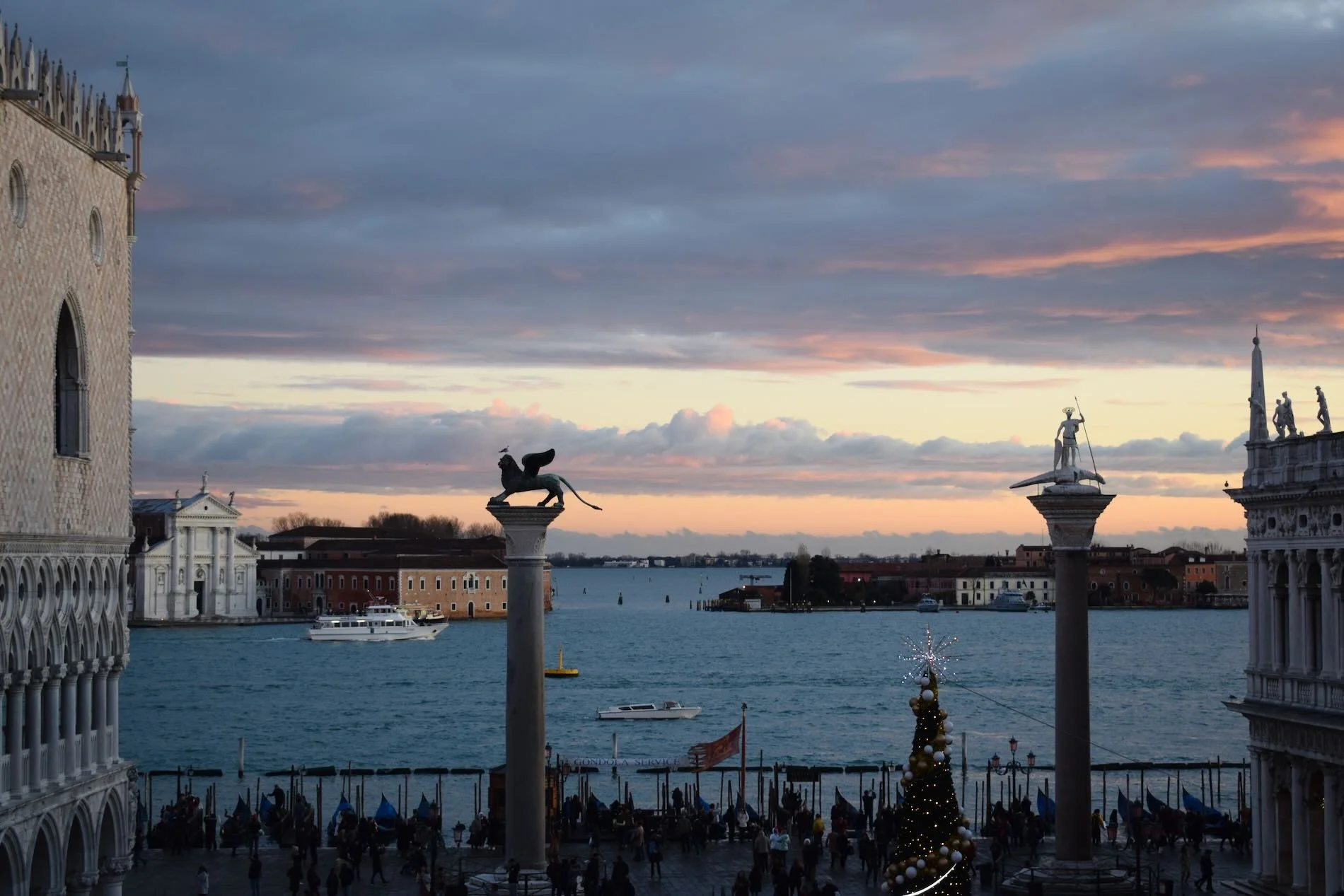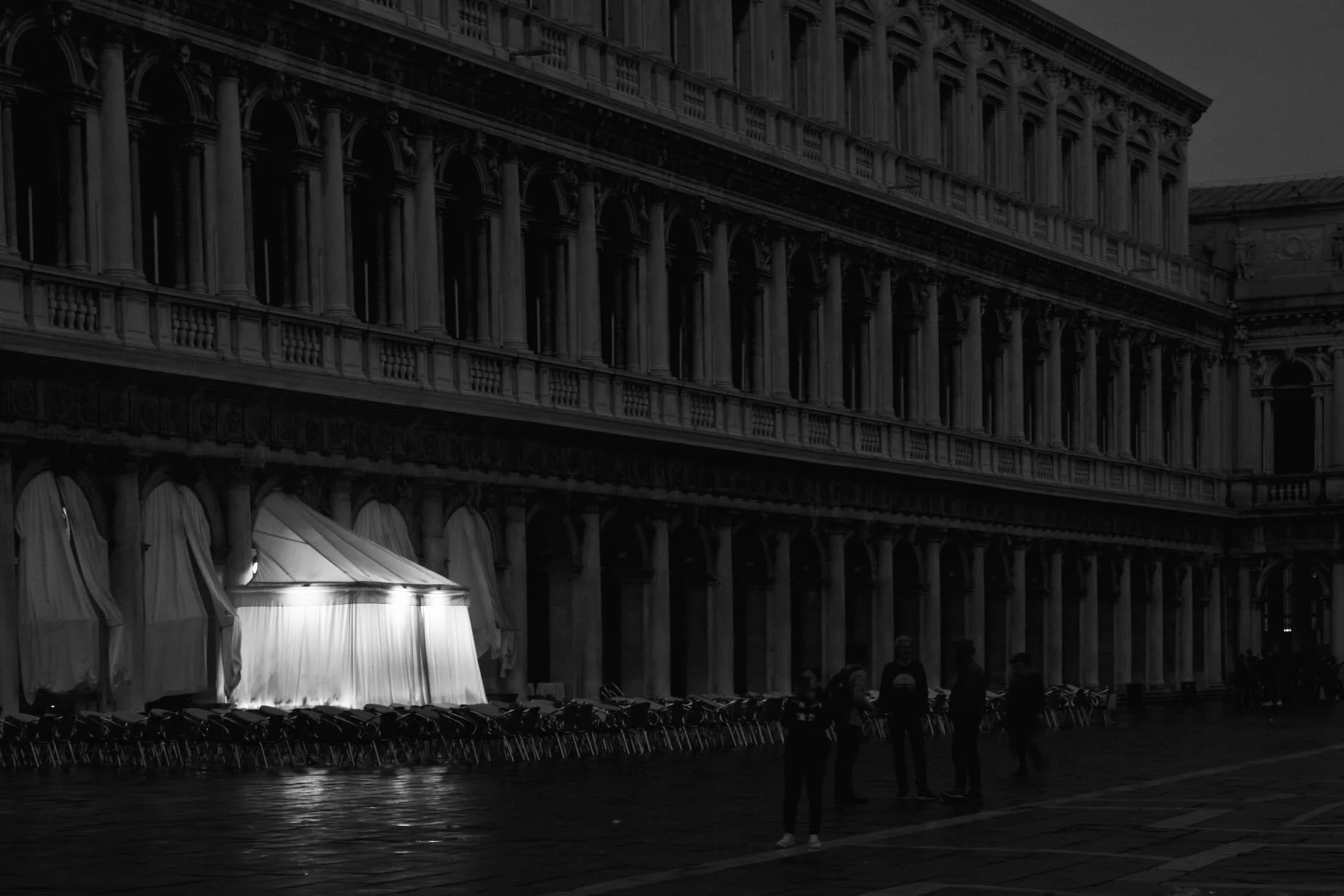“Walking through the foggy urban spaces, I can almost do the impossible, to be alone in Venice. People come into sight, and the go, and there are moments when no one is to be seen. In Piazza San Marco, as it gets darker, I experience the magical moment where the sky is almost dark, but the lights are still off. The podium where the musicians should be performing glows, a dim yellow light. That is all, the blue hour at it’s best.